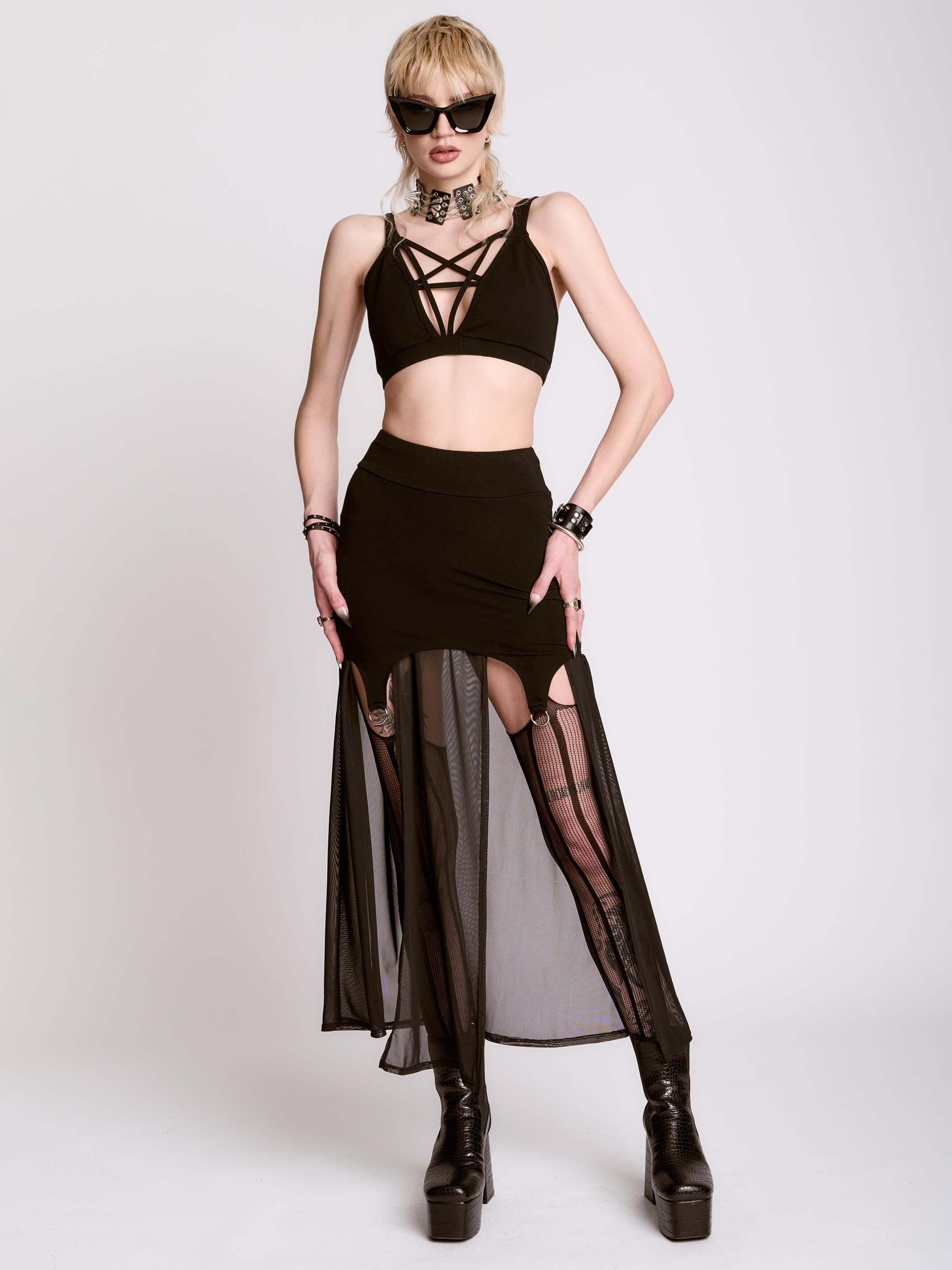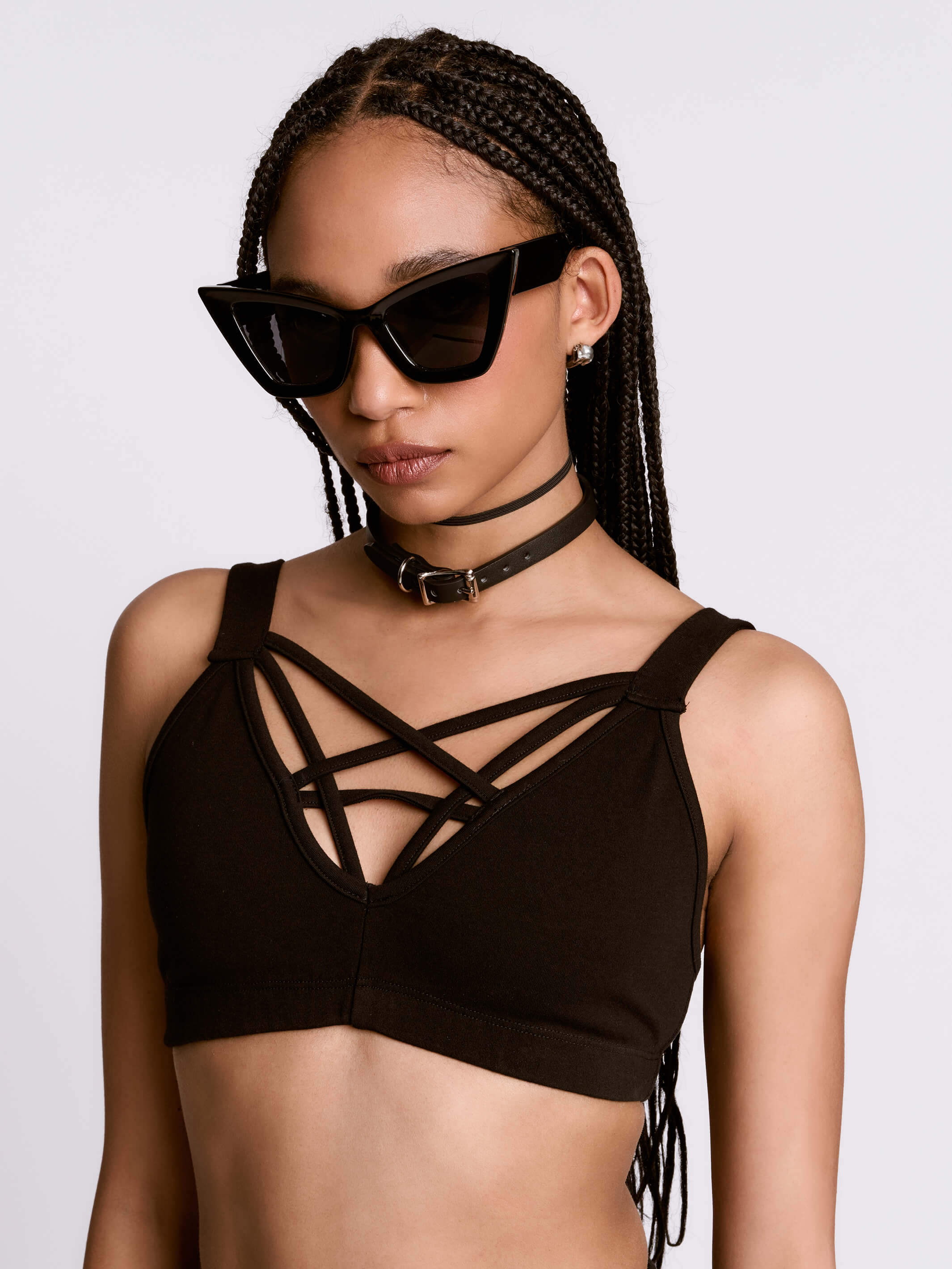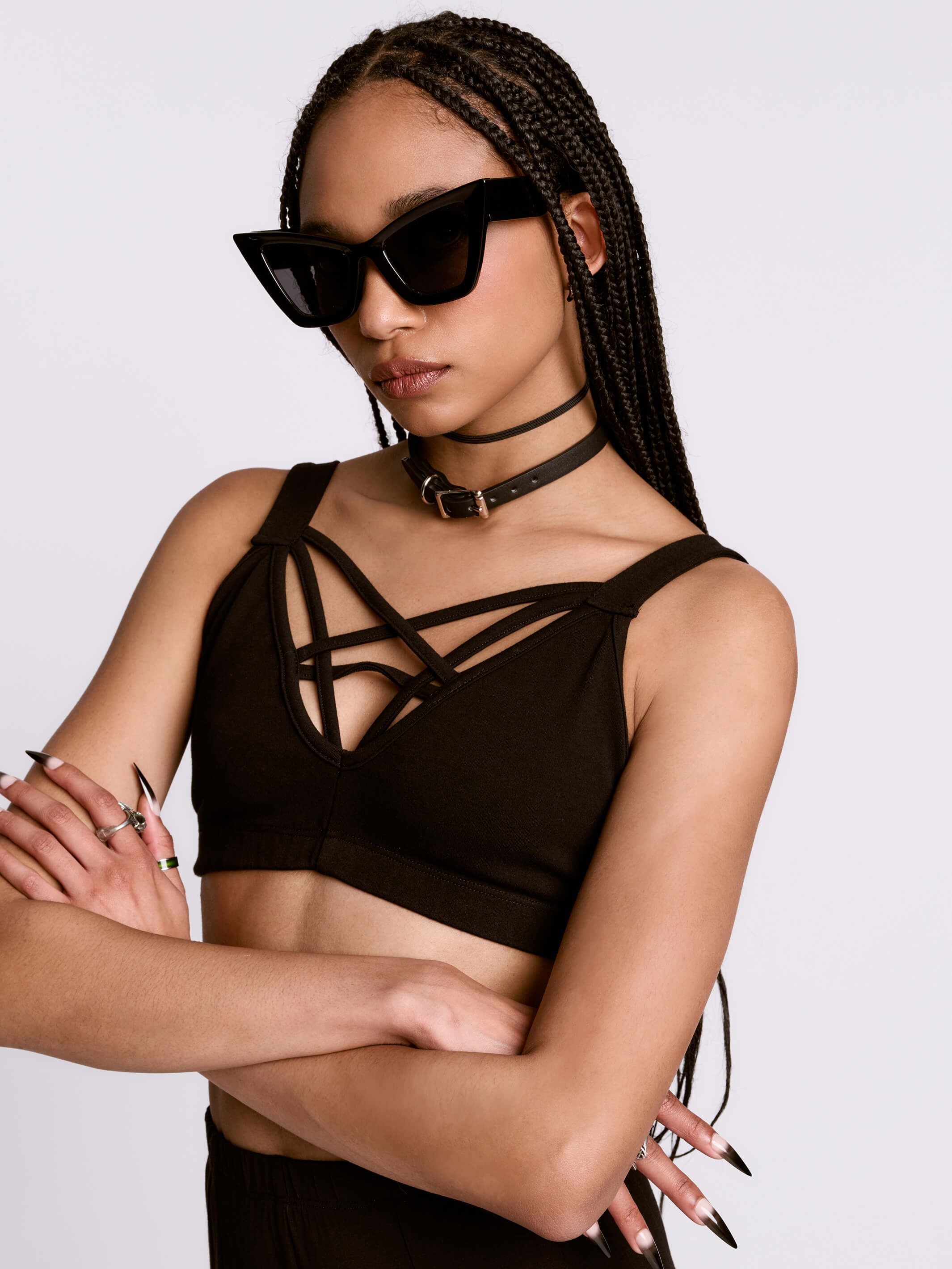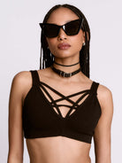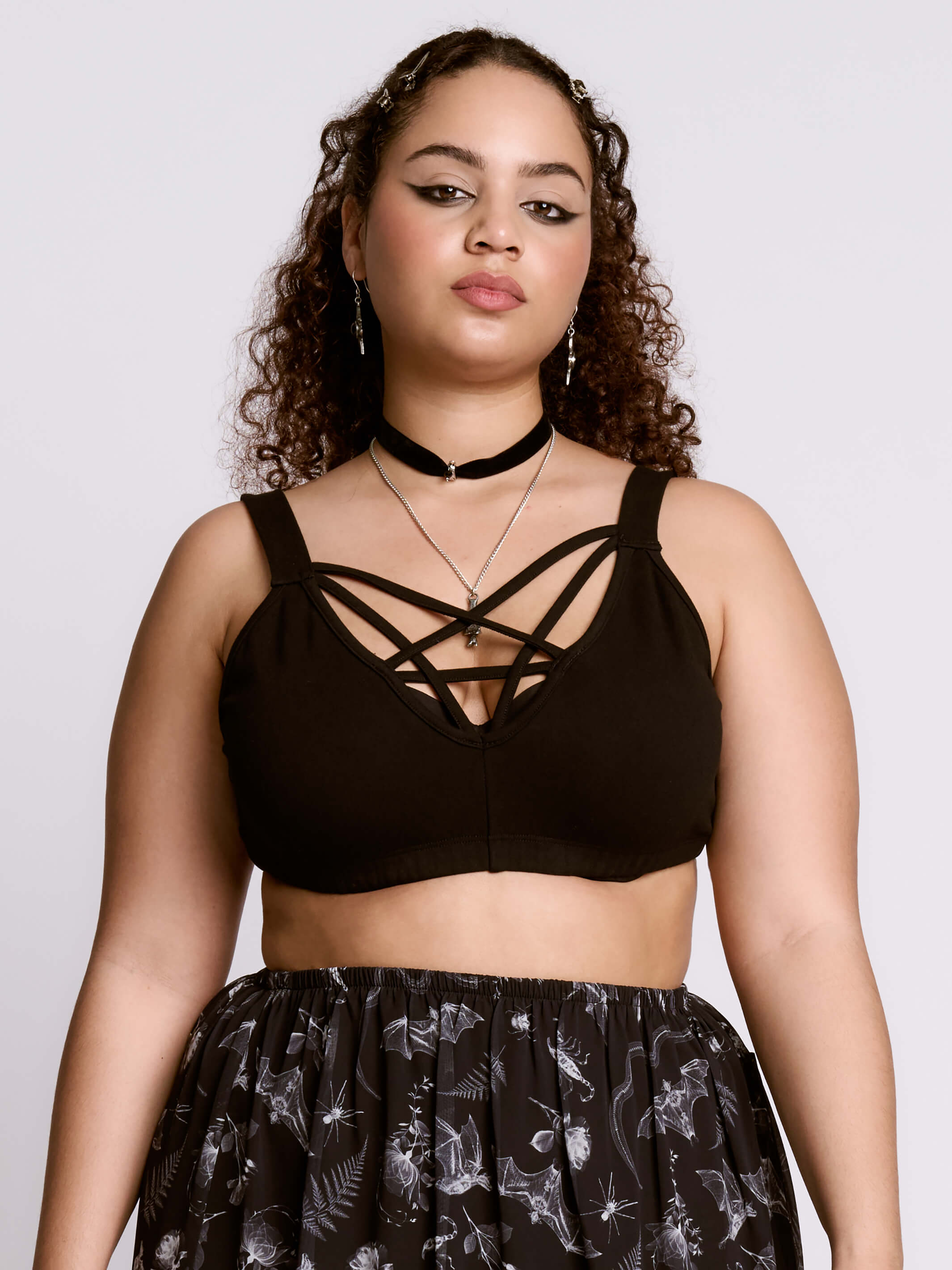Embrace hot goth summer with custom bralette featuring elastic hem and adjustable straps.