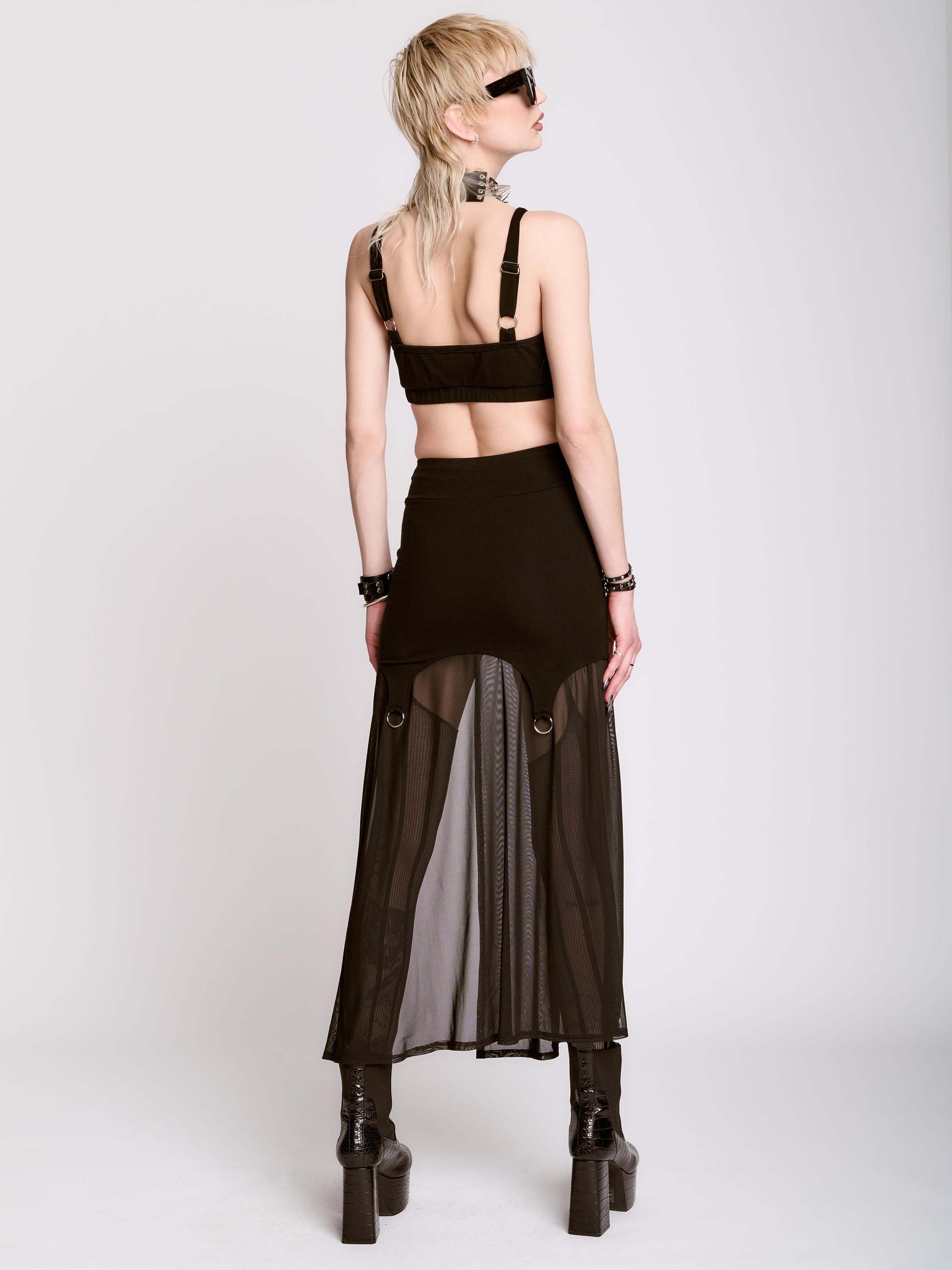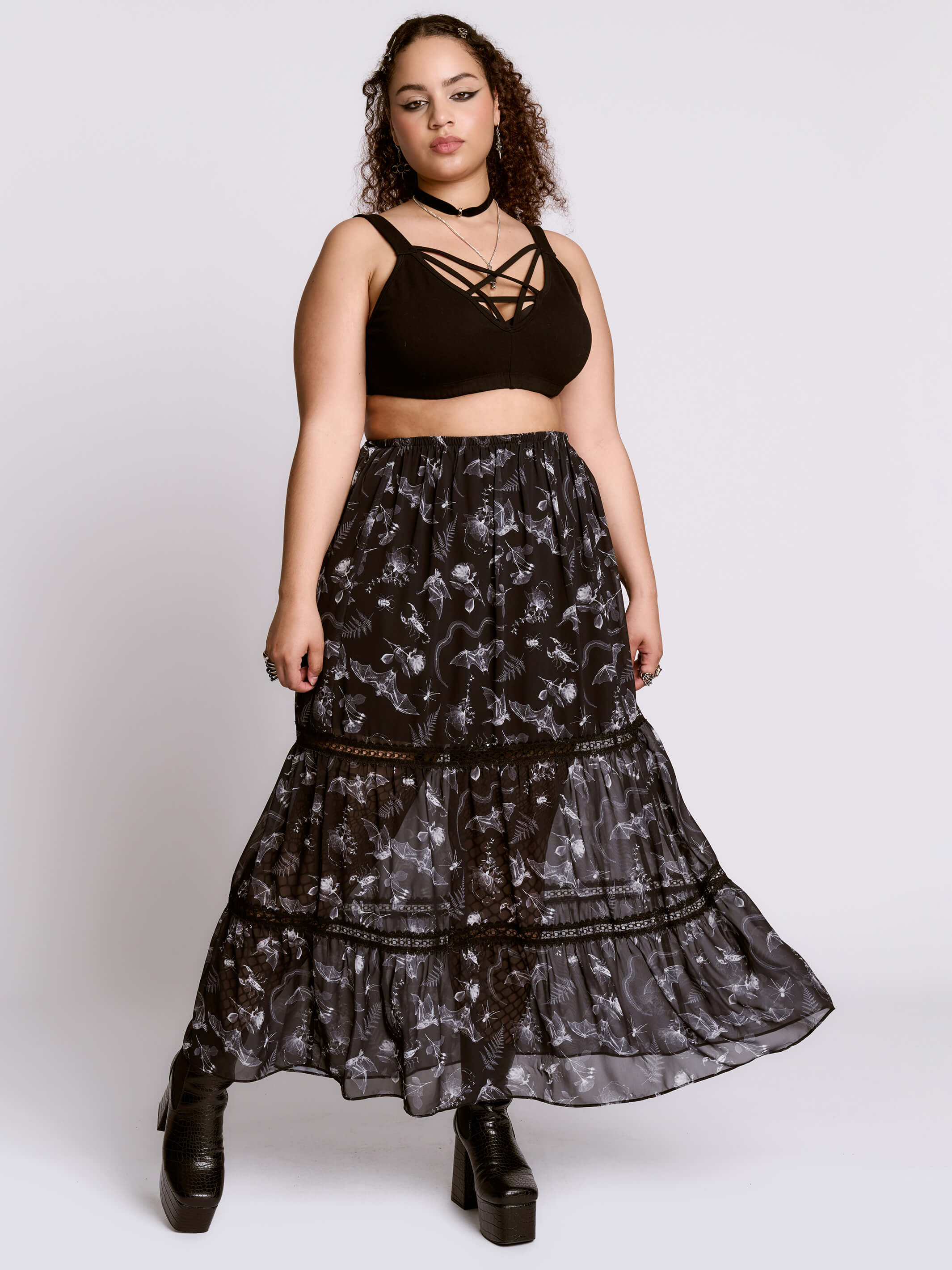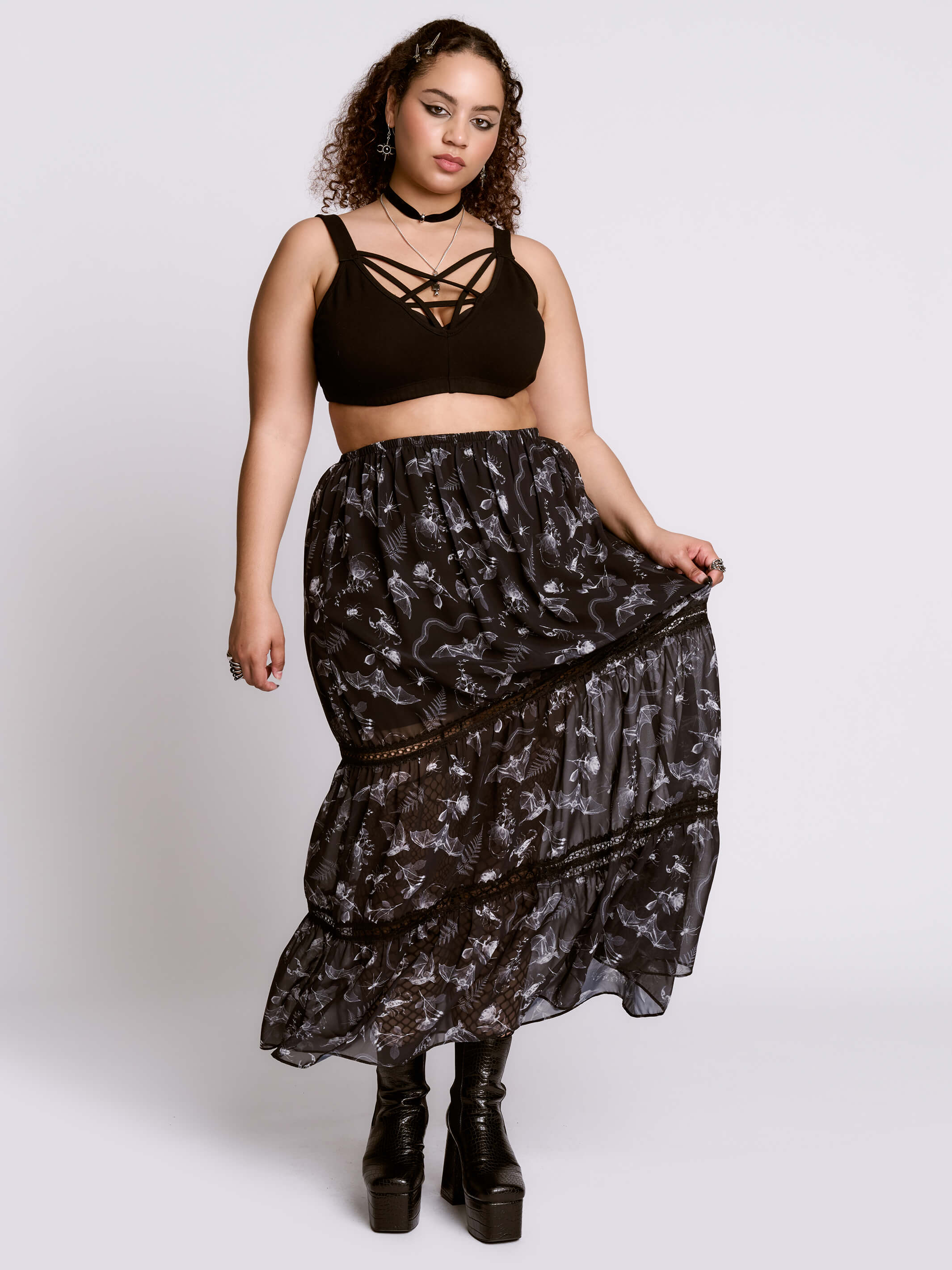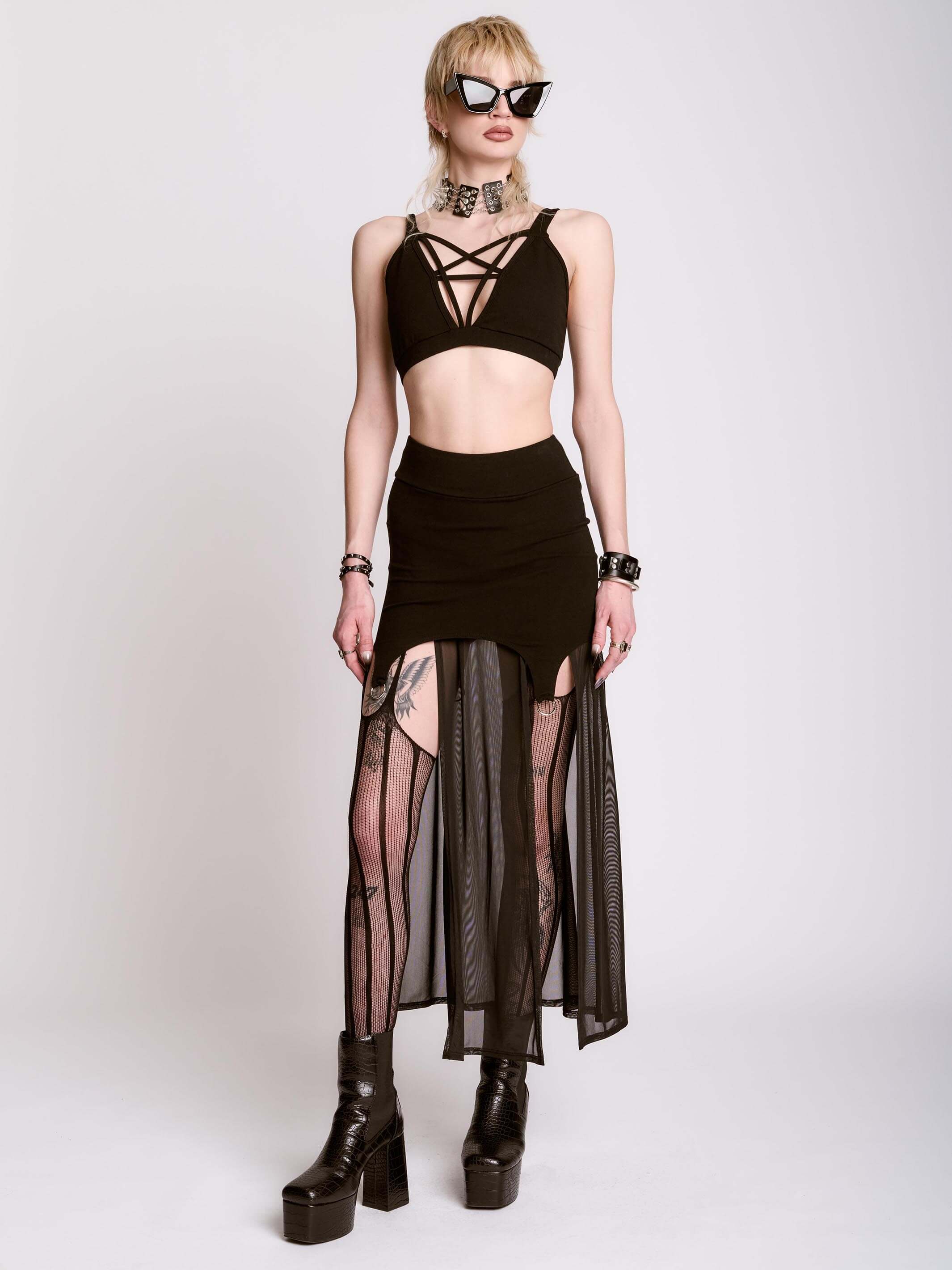Embrace hot goth summer with custom bralette featuring elastic hem and adjustable straps.