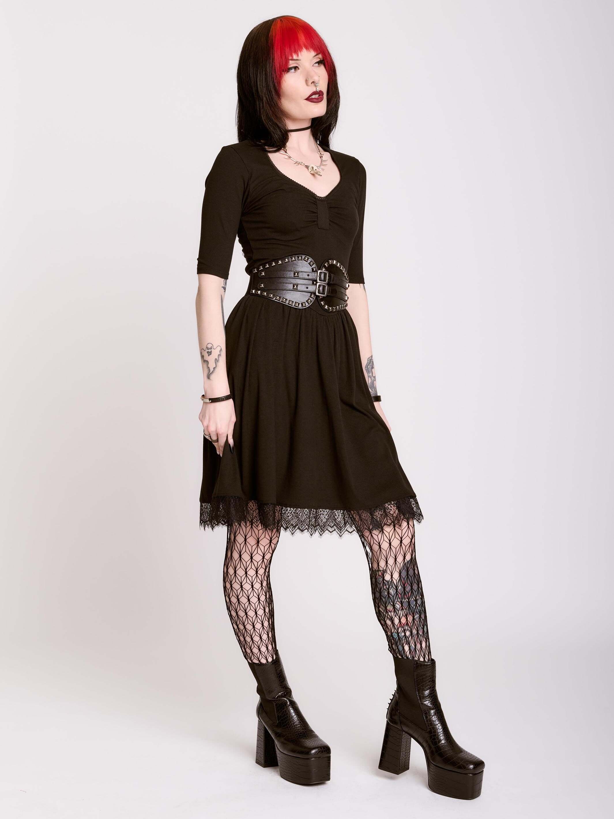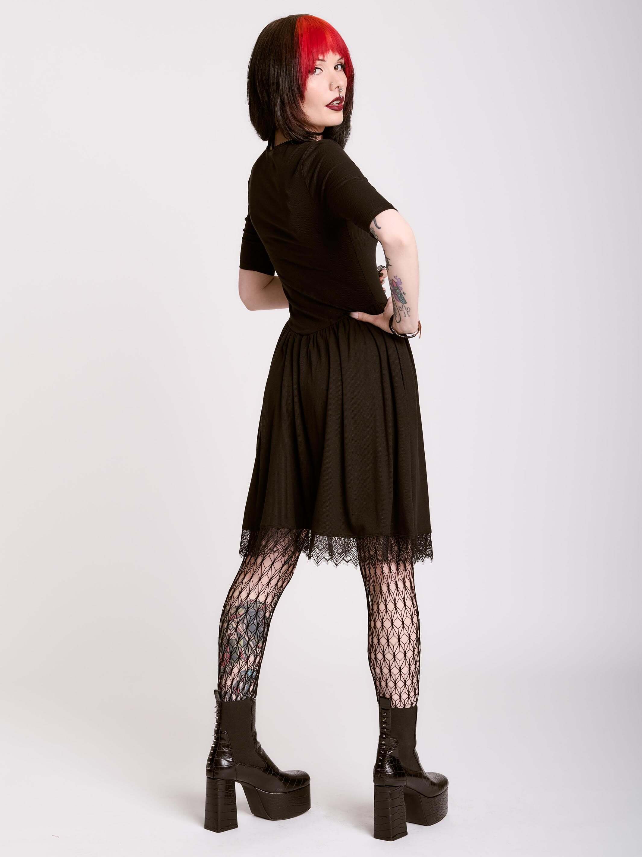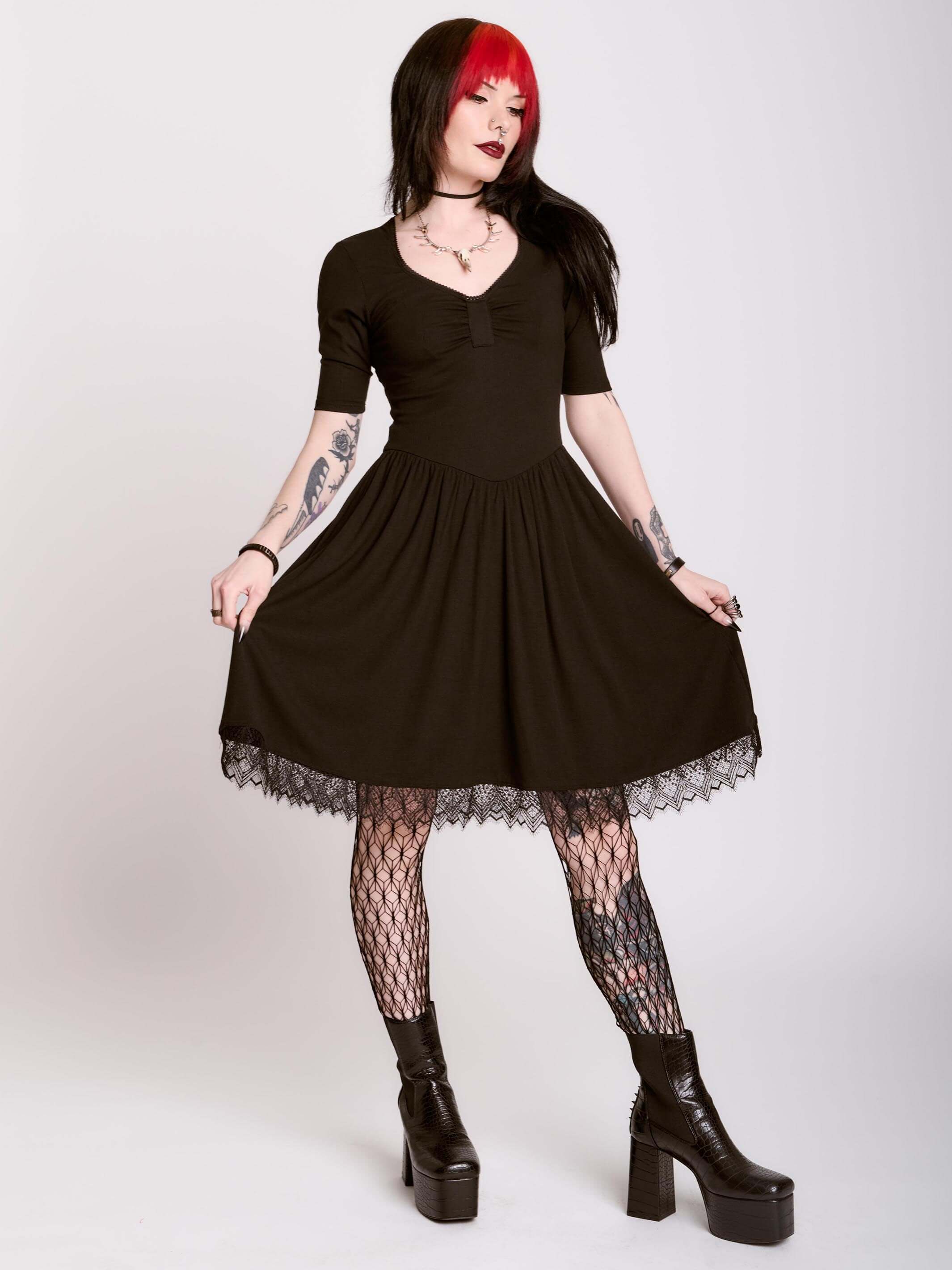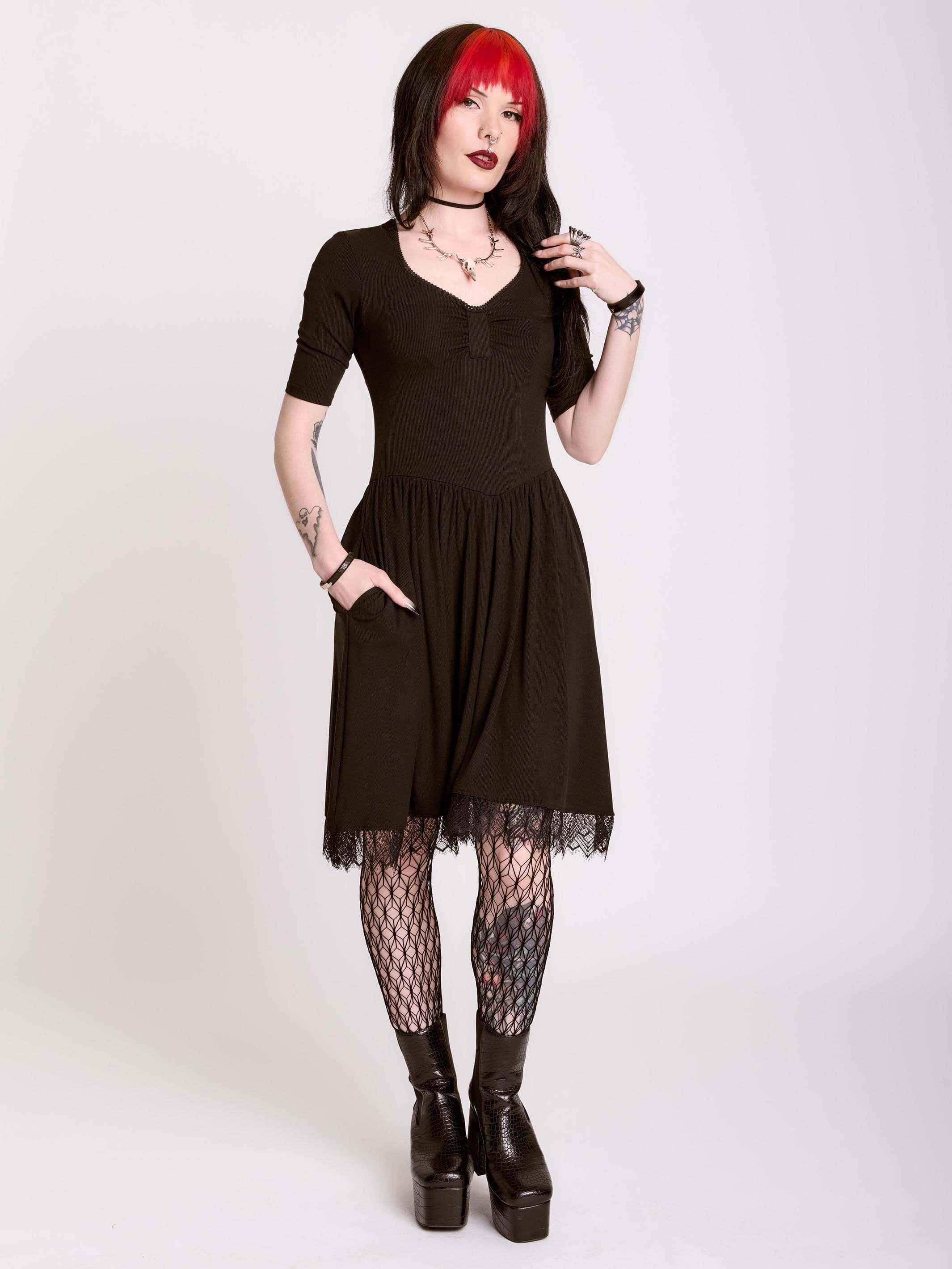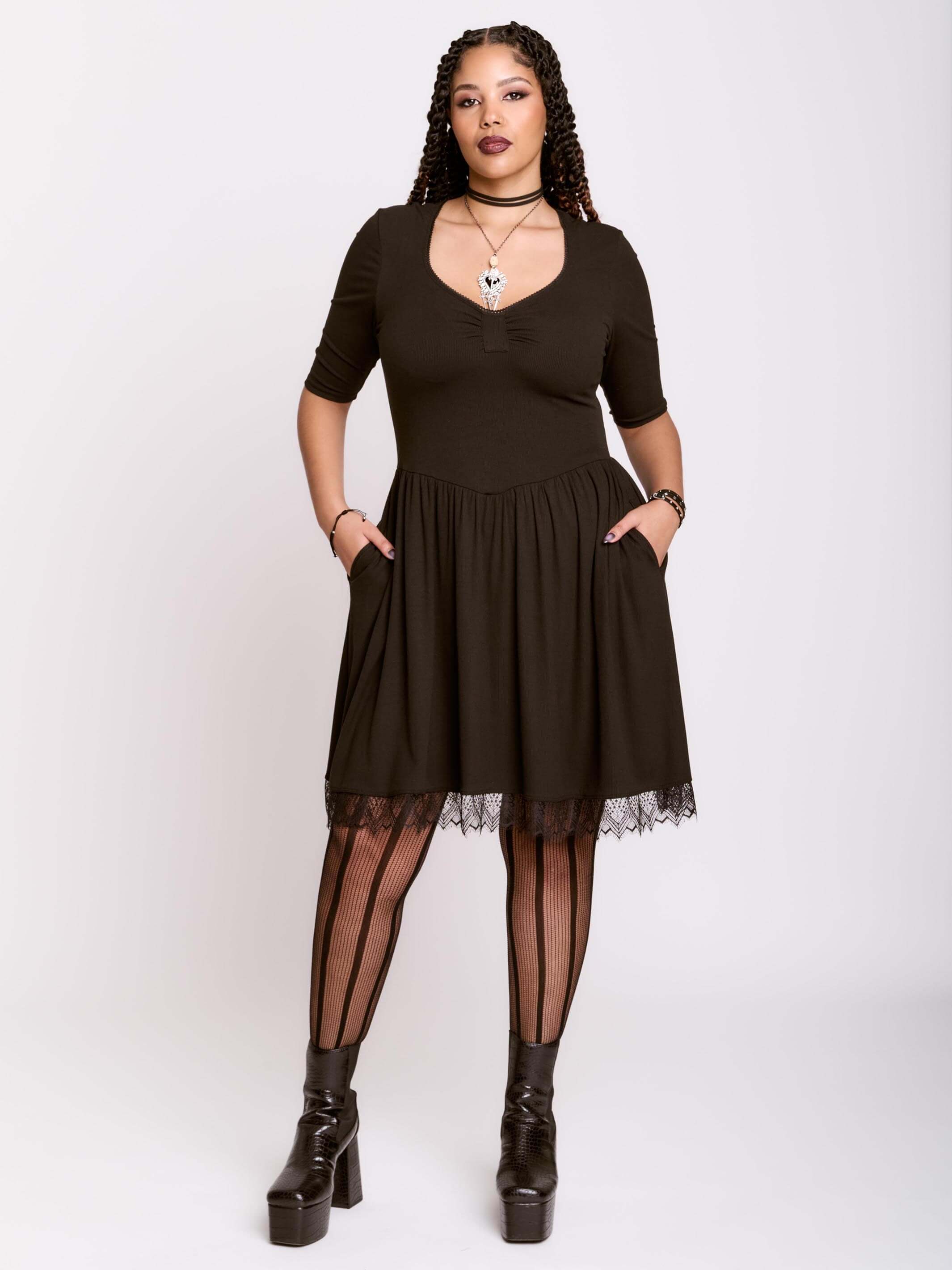 Figure flattering sweetheart neckline with rouching at the bust, elbow length sleeve, side pockets, elastic waist, and Chantilly lace hem. Easy pull on construction.