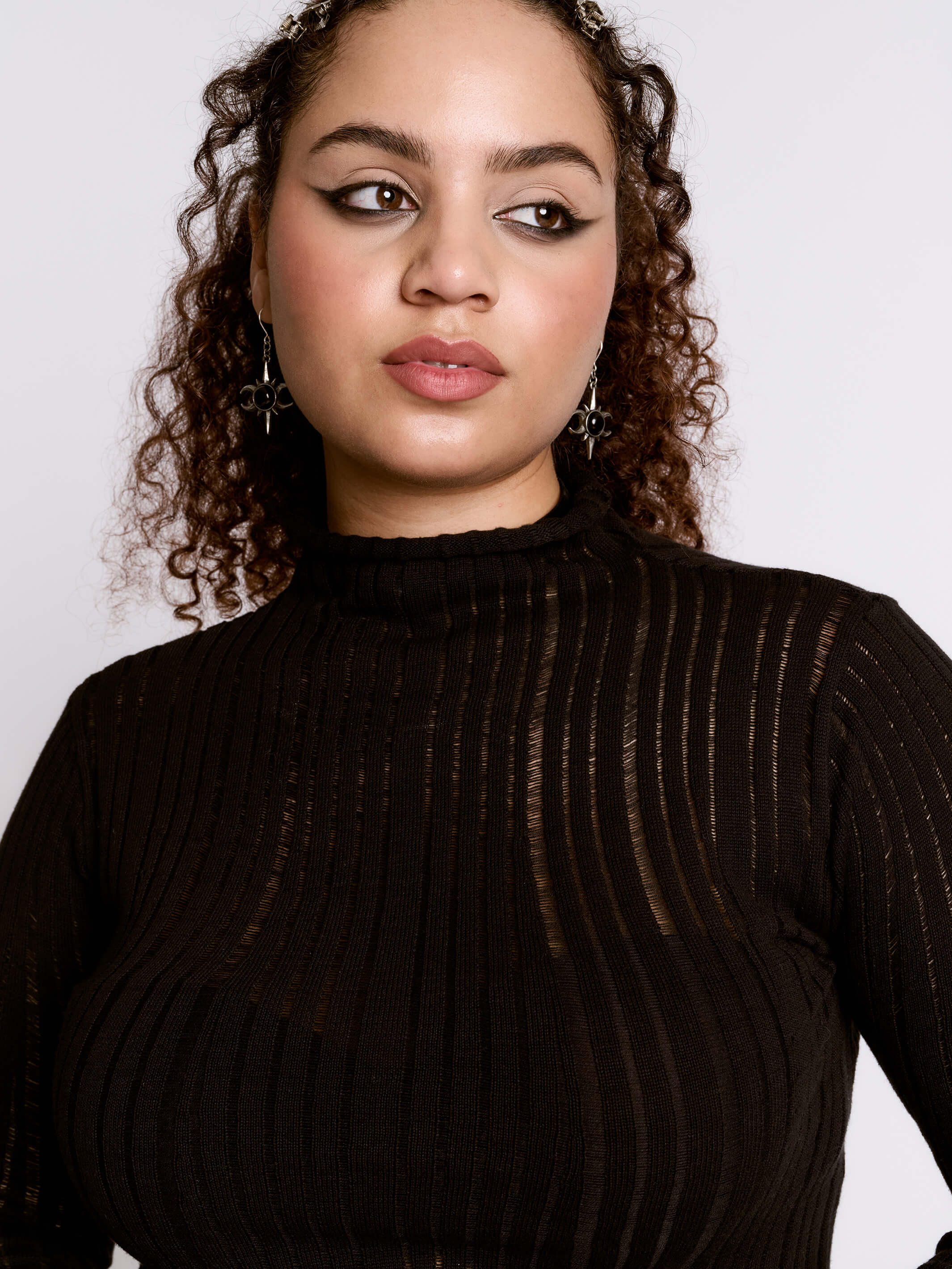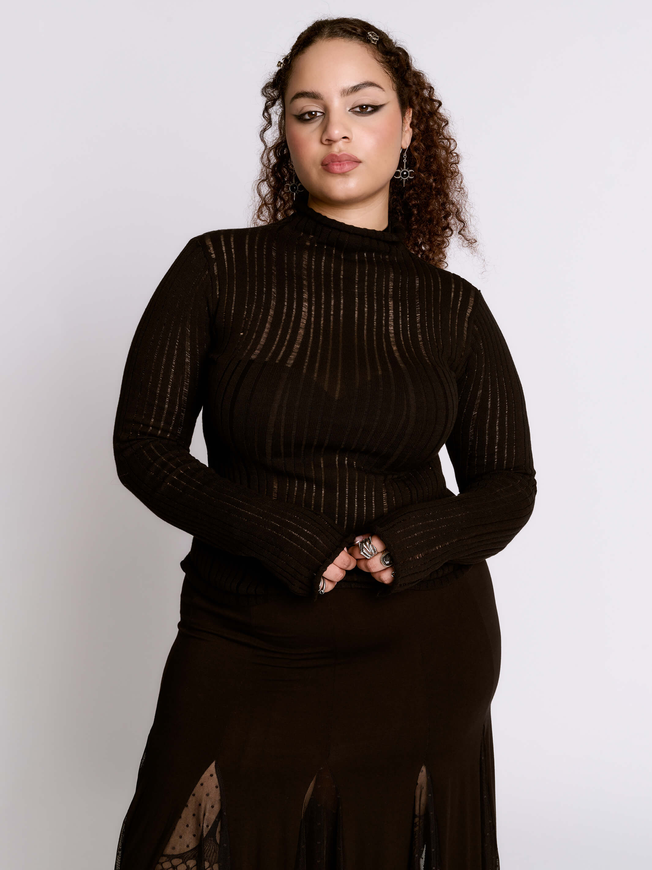 The perfect layering piece. 100% cotton turtleneck with peekaboo drop needle stitching.
