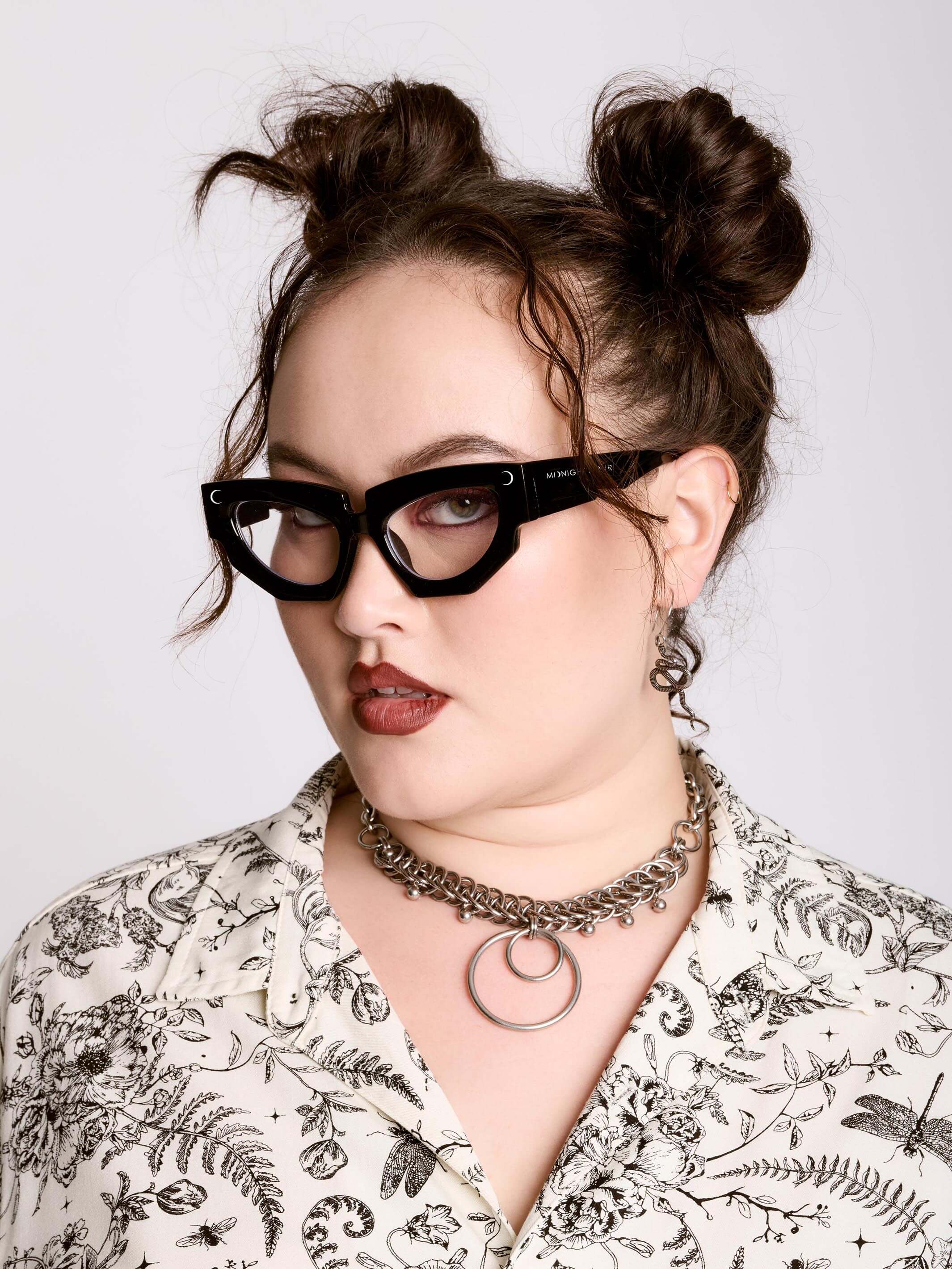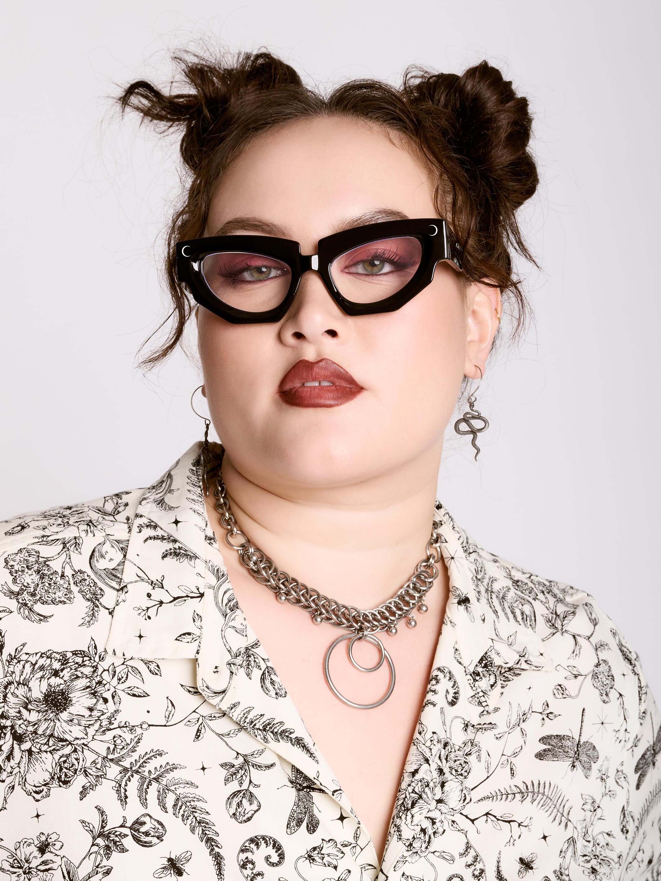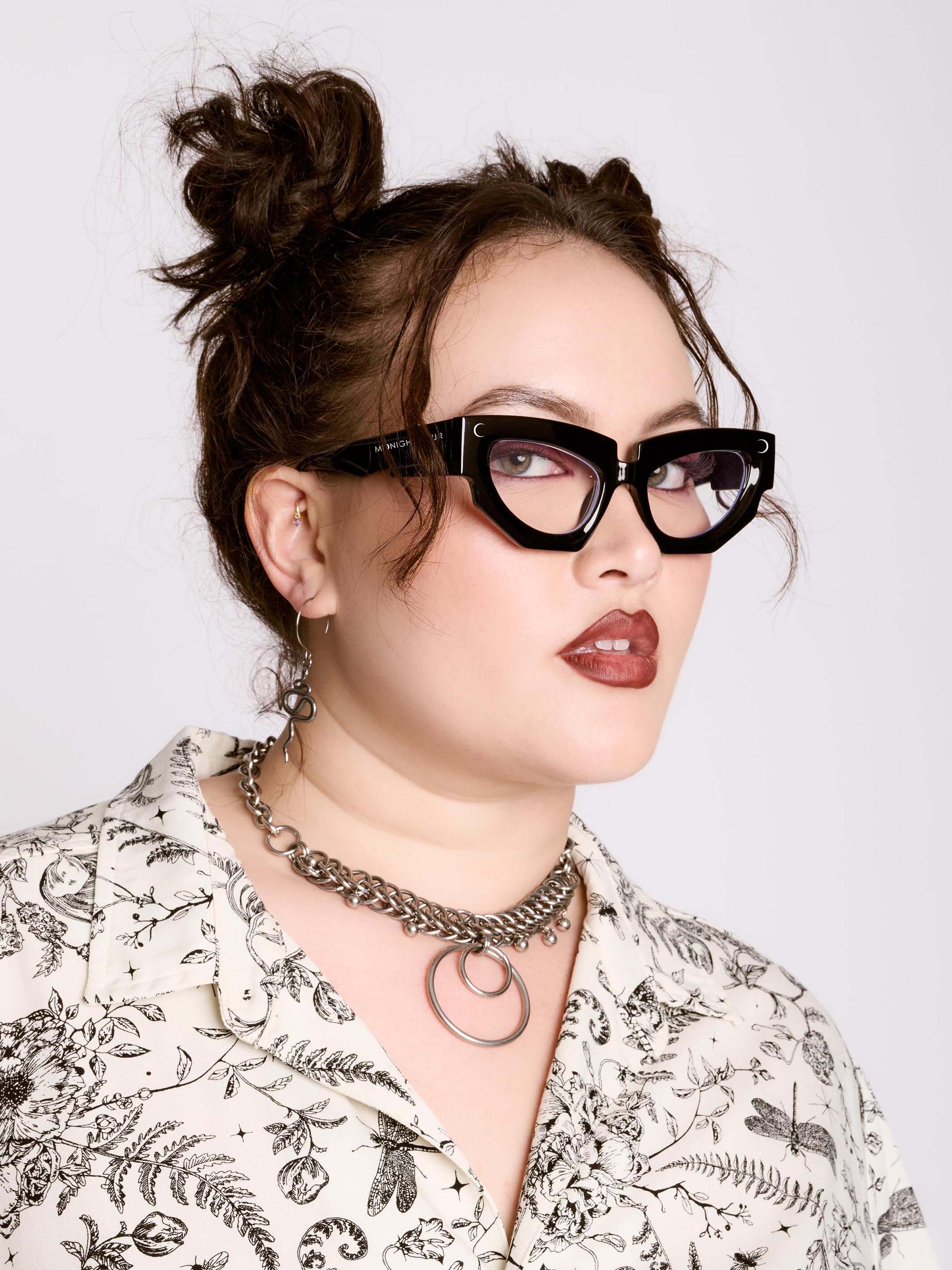 Show off your dark academia side in these custom glasses. All-black frames with custom logo on the sides and clear lenses.