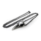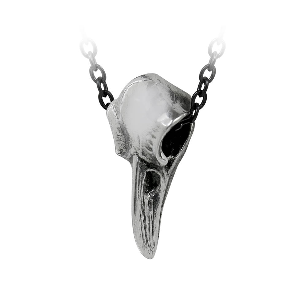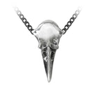 An authentically detailed miniature raven's skull pendant in polished pewter, suspended by a chain passing through the skull's eyes. Handcrafted by our friends at Alchemy of England. Made from fine English pewter. Comes with branded velvet gift bag.