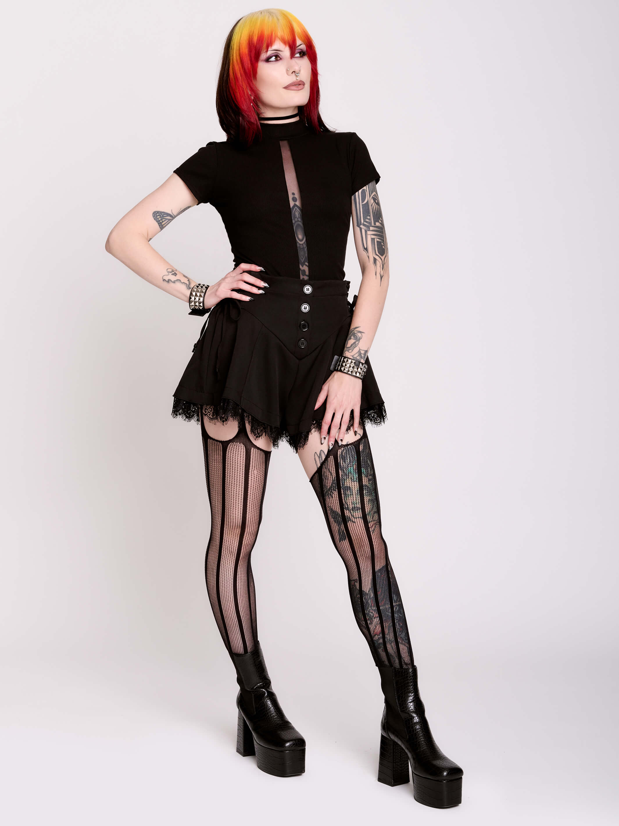 Styled with our Tonal Striped Garter Tights, Fishnet Boots, Black Mini Skort and Fishnet Garter Tights (sold separately)